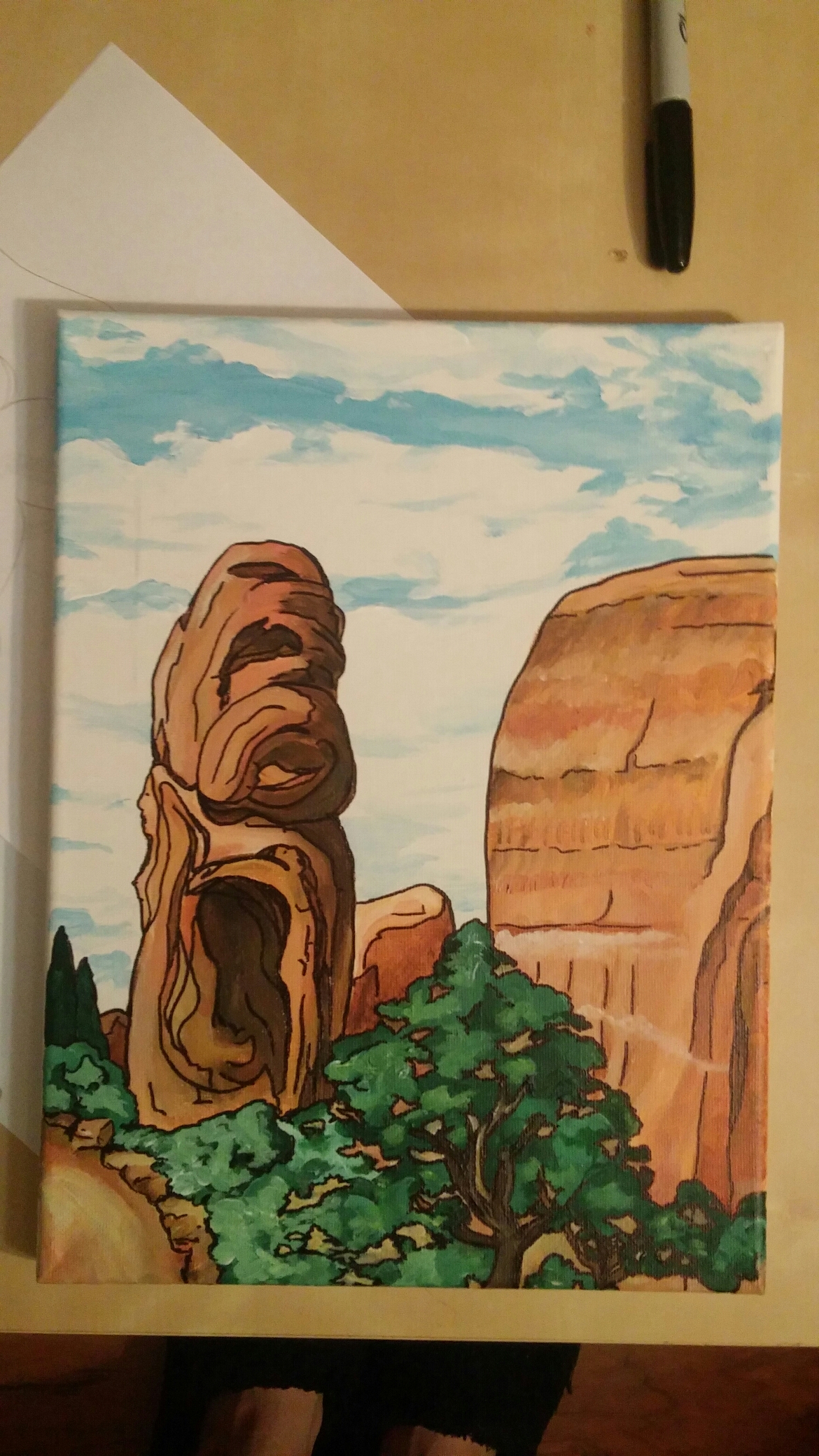 I’m almost done with this next painting in my series. It’s based off a striking rock I met while hiking in Utah about 5 years ago. If you look closely the rock that looks like a face also is comprised of figures. There are some final touches that still need to be done, but I thought I’d share my newest creation.