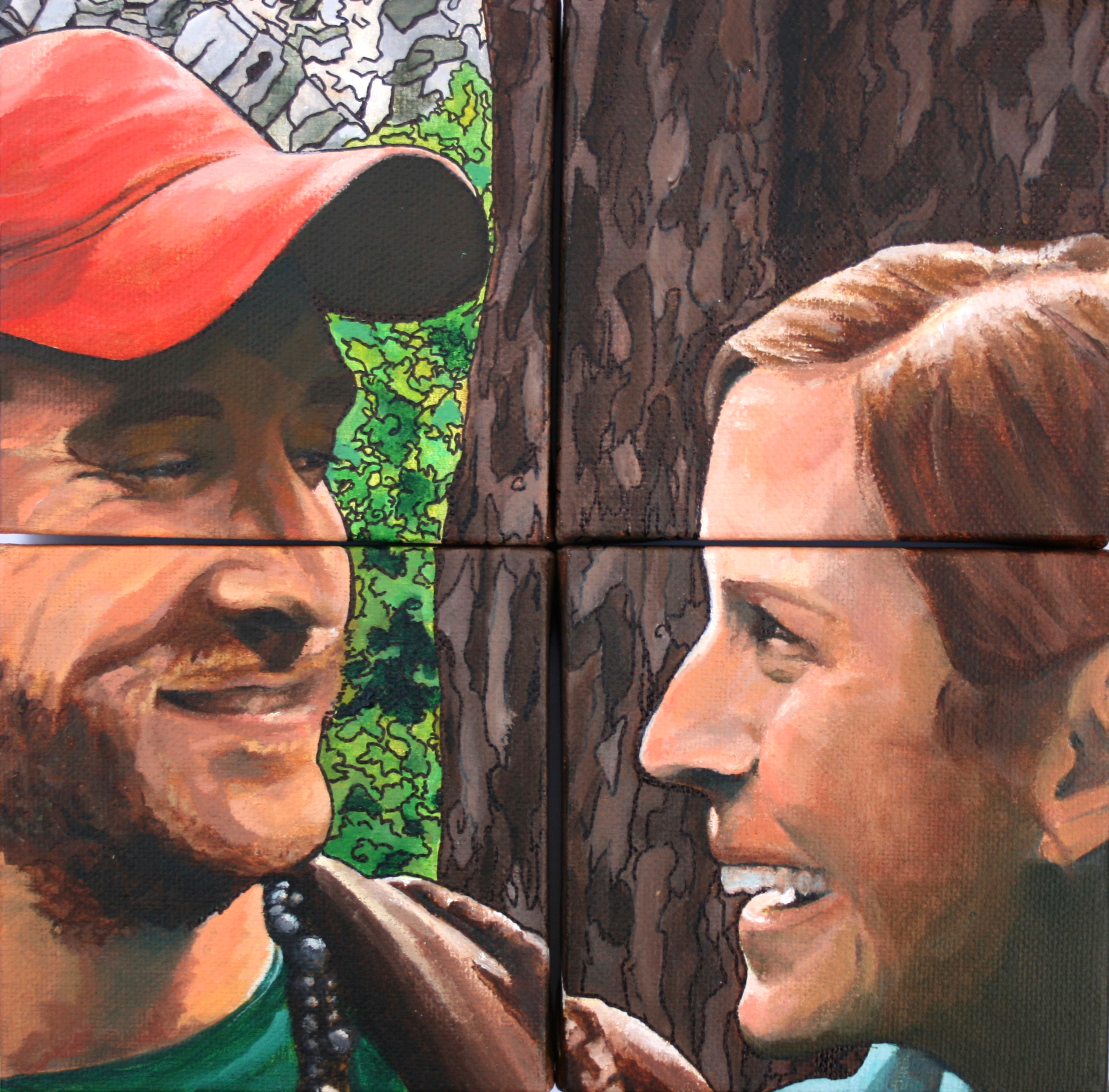 Works/San José Gallery had an open call for artists to enter portraits in the form of a square. I had 4 mini canvases (4″ x 4″) and used them to create an autobiographical portrait of me and Christian to celebrate our love, squared. This painting was particularly challenging, but I think I more or less captured our gazes and expressions. It will be on display in the SJ downtown gallery from Jan. 25 – mid-February.