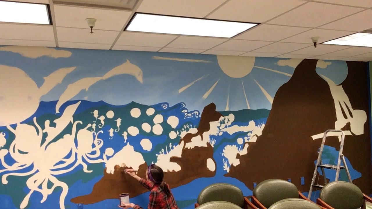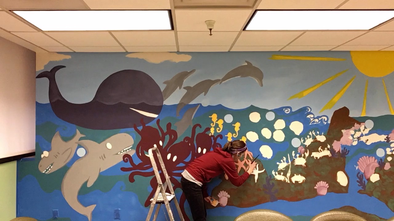 The volunteer mural project is now over. 7 straight days, 43(ish) hours (plus 10 or so for design sketches and revisions), of working on the 22’ x 10’ wall was both physically and mentally challenging. I was completely absorbed by this project and time became more abstract than normal. By 6:15PM on 2/15/19 (the last day), part of me knew I needed to do more – maybe one more bubble or bright piece of coral. It’s such an interesting experience creating a giant piece of art that I can’t just casually keep working on at my own pace. There was a timeline, a goal to have it complete, so the space could be used again for the families who frequent the waiting room. It was art that wasn’t created for me, but for other people to enjoy and to interact with.
