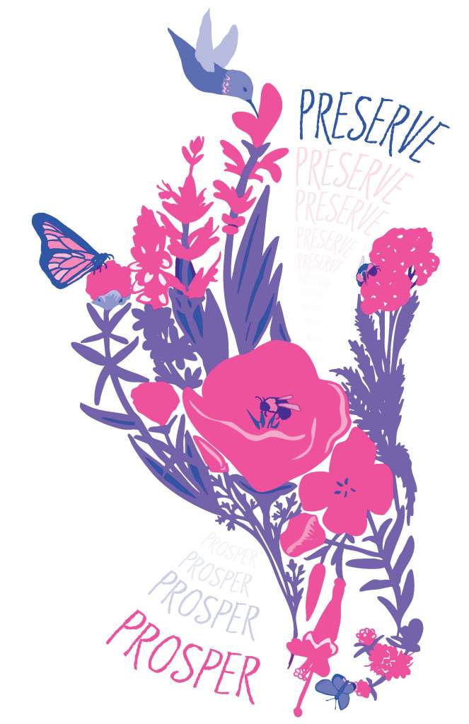 This illustration was designed as a poster to promote awareness of the value that native plants and pollinators provide to human well-being. A hand emerging from a collage of flowering plants tells a visual story of our connection to nature and how our actions have consequences. The pollinators interacting with the flowers, and the words fading in and out of the design, further convey the message: we must preserve our natural surroundings to thrive.