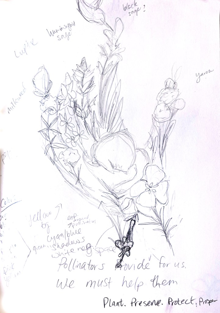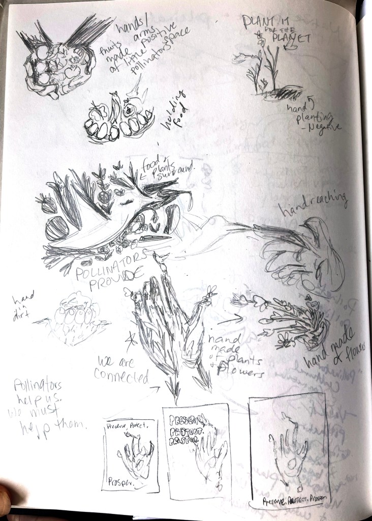 Before figuring out what design would be best for this poster project, I researched and brainstormed the topic of native plants and pollinators to figure out the best solution. Part of the constraints on the project was to create an image emerging from other smaller images. Below are photos from my sketchbook capturing my creative process.