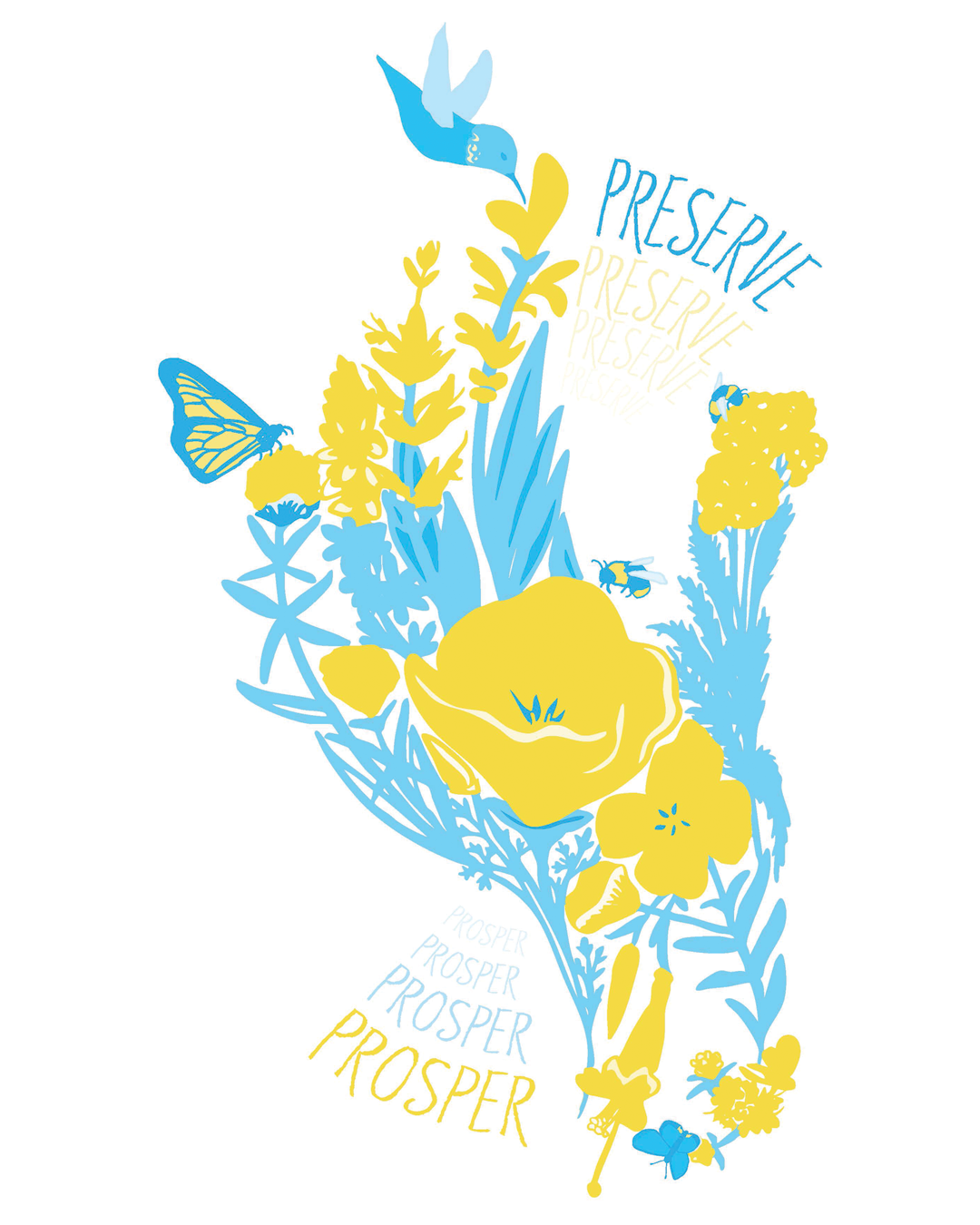 This illustration was designed as a poster to promote awareness of the value that native plants and pollinators provide to human well-being. A hand emerging from a collage of flowering plants tells a visual story of our connection to nature and how our actions have consequences. The pollinators interacting with the flowers, and the words fading in and out of the design, further convey the message: we must preserve our natural surroundings to thrive.