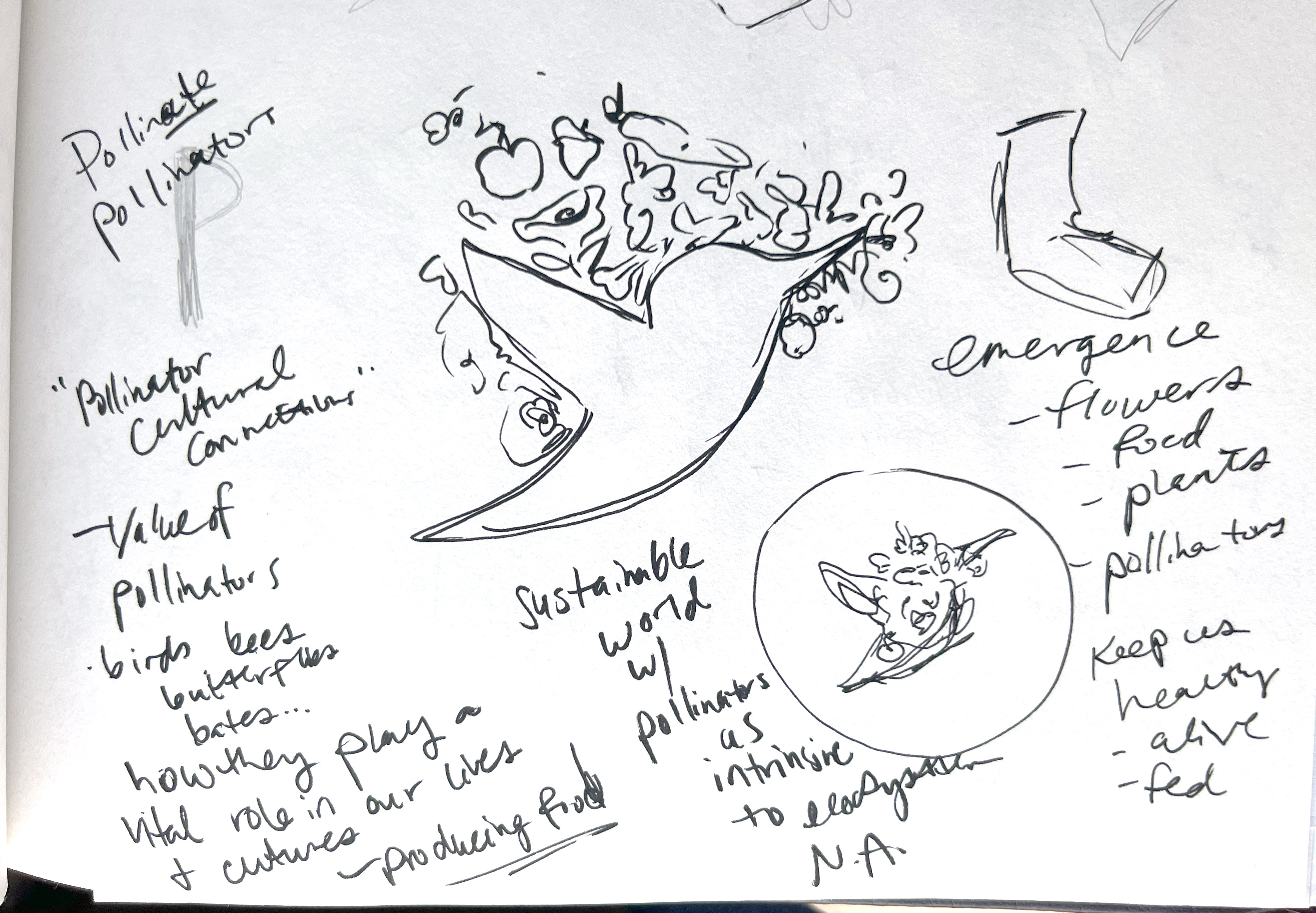 Before figuring out what design would be best for this poster project, I researched and brainstormed the topic of native plants and pollinators to figure out the best solution. Part of the constraints on the project was to create an image emerging from other smaller images. Below are photos from my sketchbook capturing my creative process.