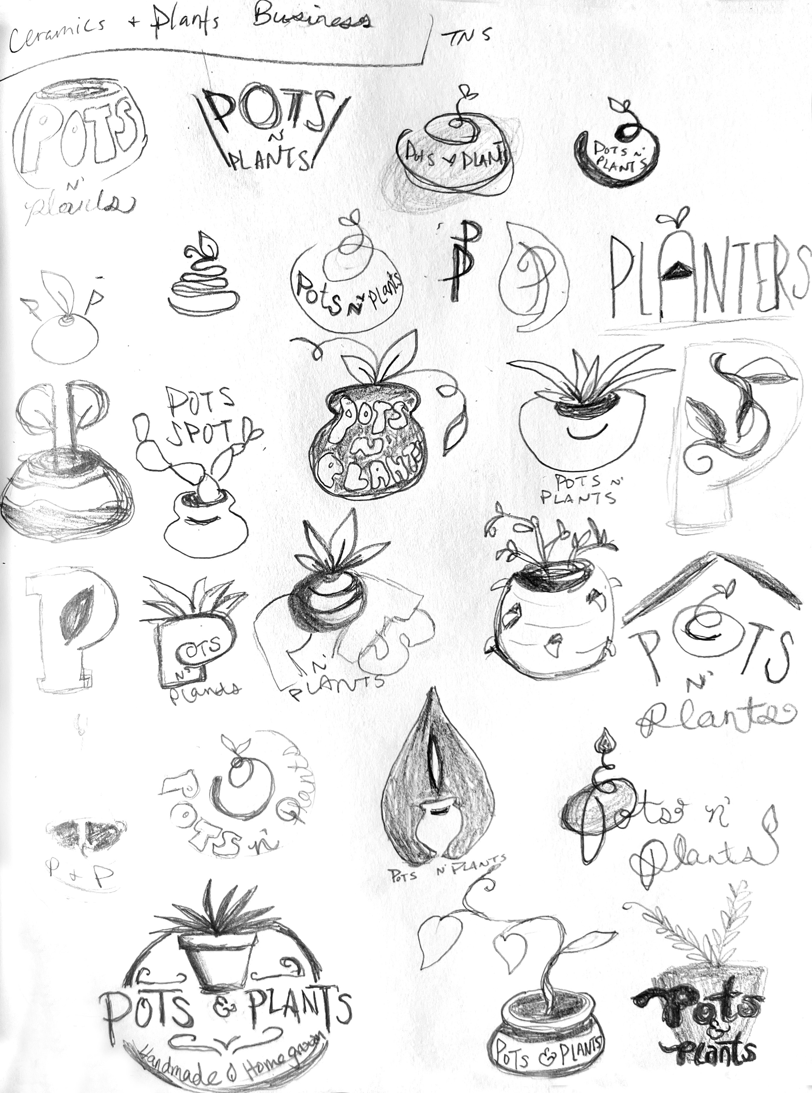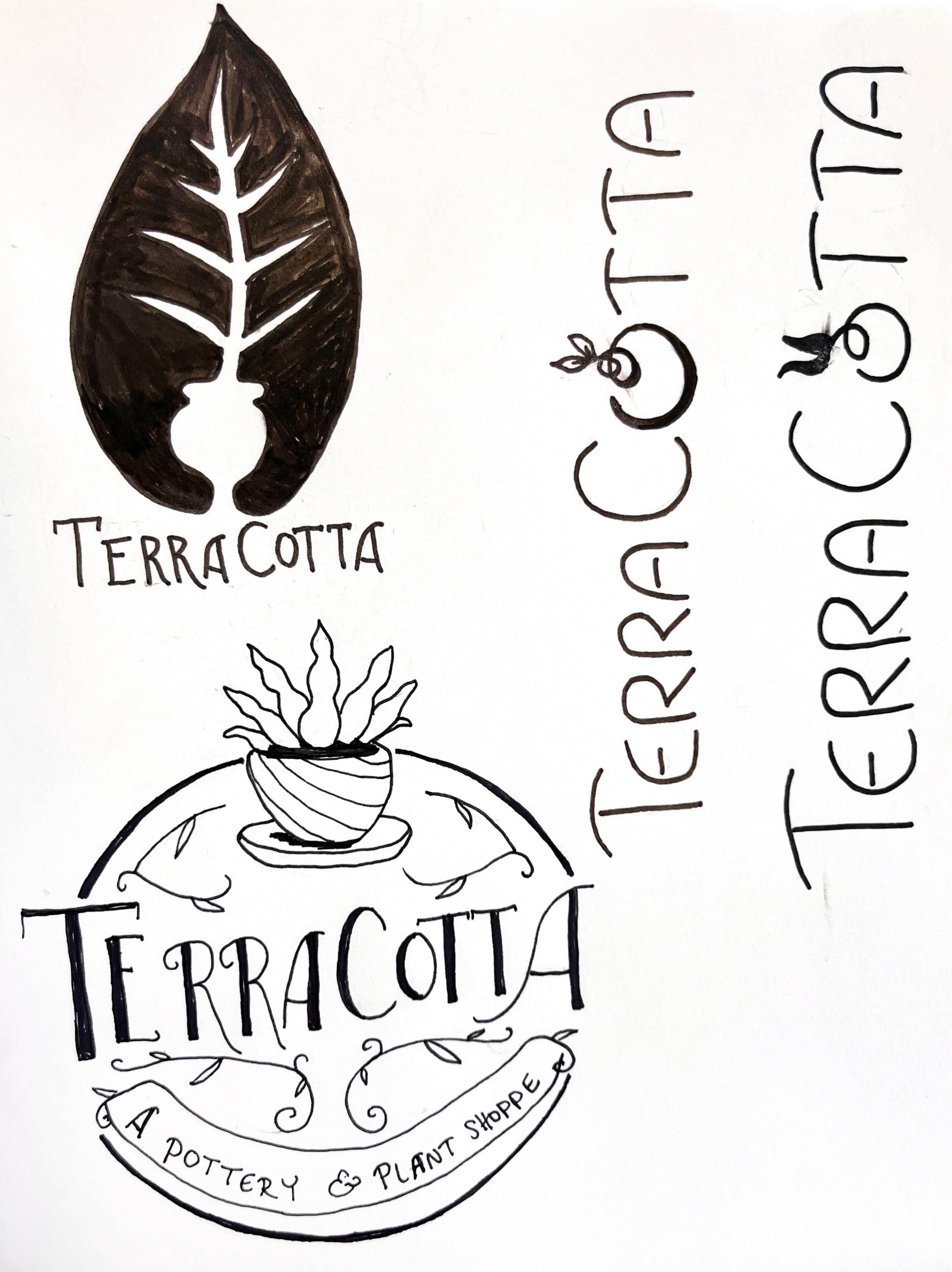 The original business name was Pots n’ Plants as you can see in the first thumbnails and rough drafts. As I continued through the iterative creative process, I thought the name Terra Cotta was a better idea because it is the common clay used to make many traditional pots. Revision was key in this overall process, and in the end, many interesting potential logo ideas emerged.