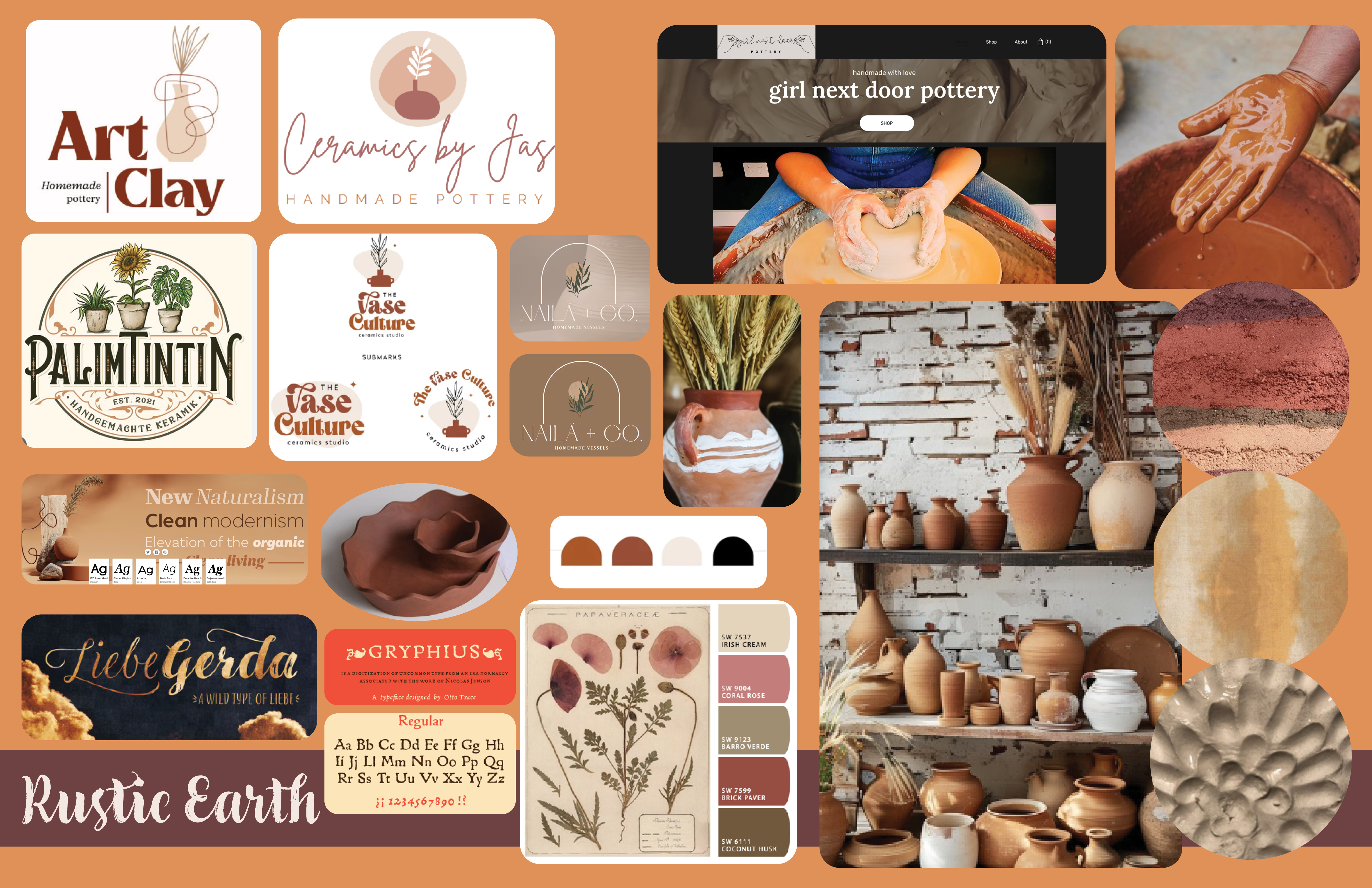 Part of this assignment required the final design to capture a specific niche aesthetic. My imagined clients were into Cottagecore, which ultimately influenced the final design of the logo and website. The use of mood boards aided in researching this specific aesthetic and helped me settle on a more rustic color scheme, which tied in with pottery-related elements.