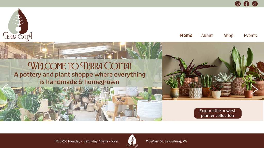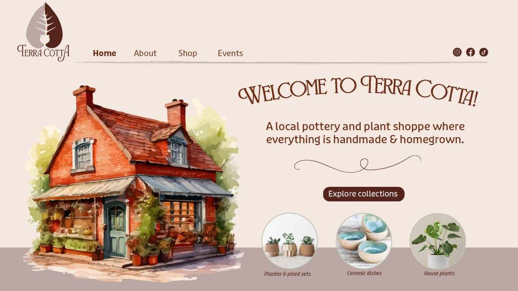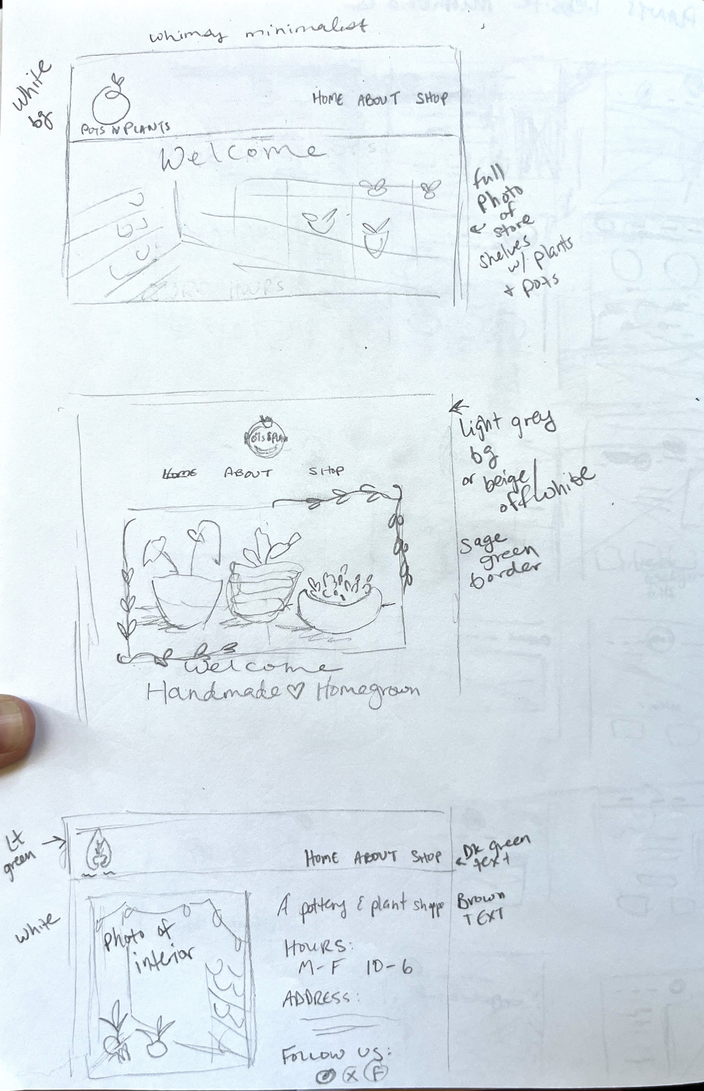 This project was an exercise in UI/UX design in which I imagined a client and new business scenario: a pottery studio and plant shop. The clients are two friends who turned their pop-up business to a brick and mortar shop and needed a website to promote their products and services. In the end, I created a logo and responsive web page design to meet the clients’ overall aesthetic interests.