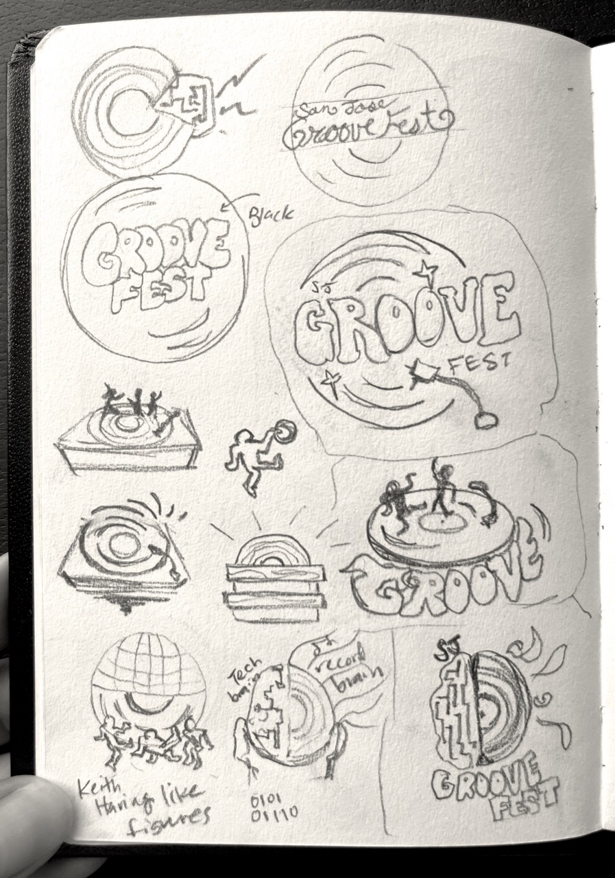 As seen in my sketchbook pages, I started brainstorming with notes before creating multiple thumbnail sketches to generate logo concepts. Hand-drawn elements appear frequently in my designs, which I digitize and further develop in Adobe Illustrator.