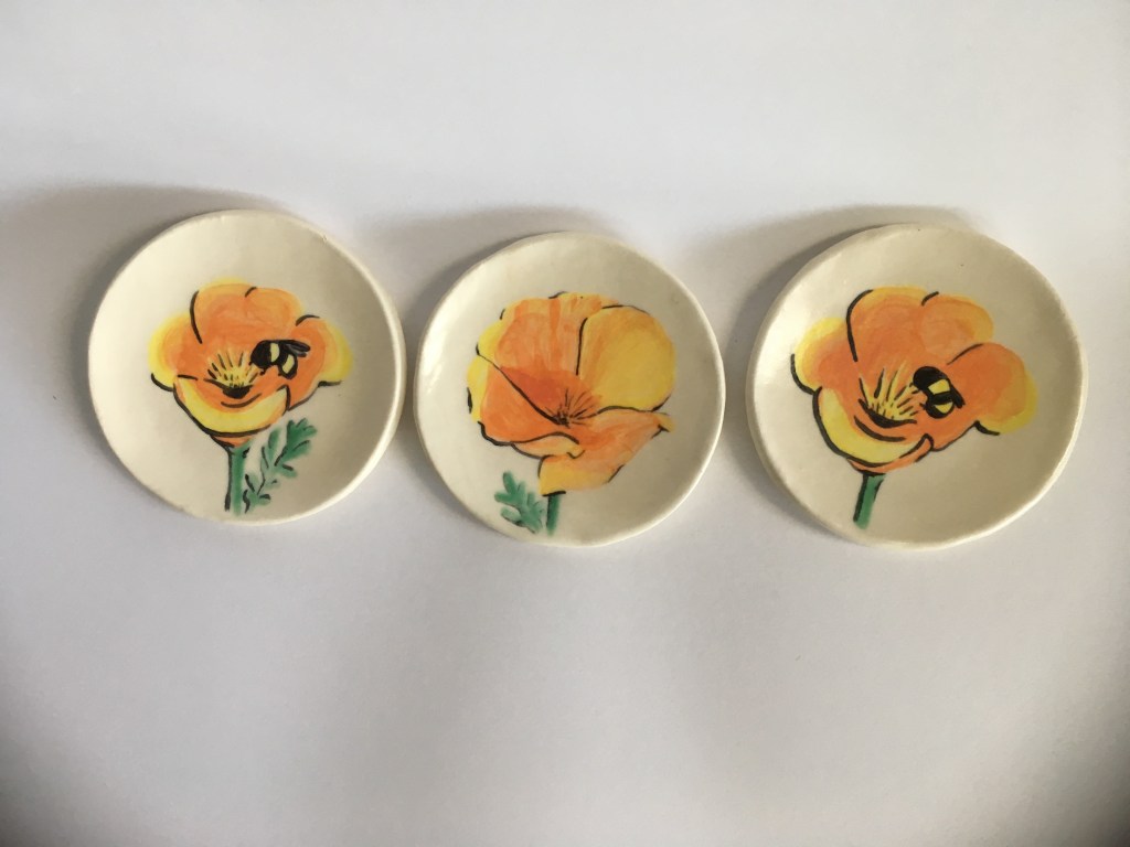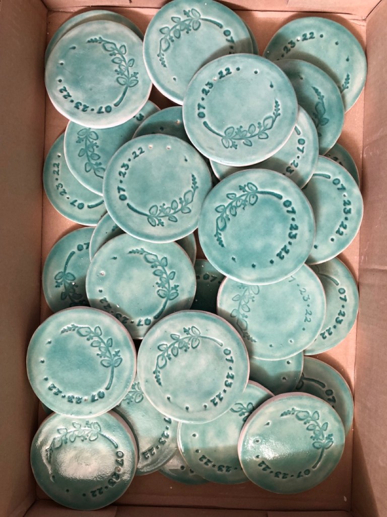 Lately I have been experimenting with underglaze on mid-fire clay. My favorite things to throw on the wheel are little pots with lids and making goblets. I enjoy hand-building as well and made an epic amount of wedding favors (small dishes and coasters) for our guests in the summer of 2022.