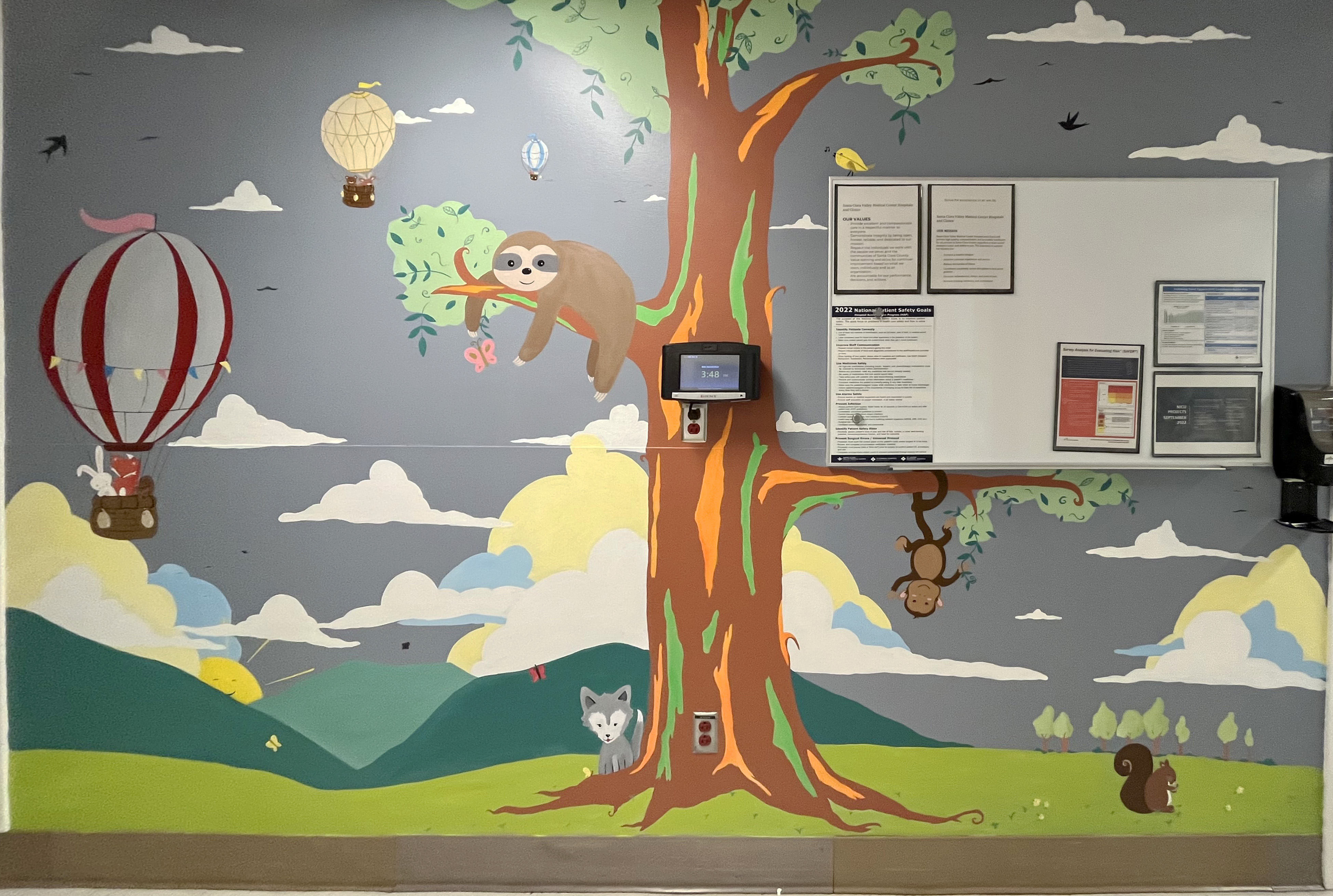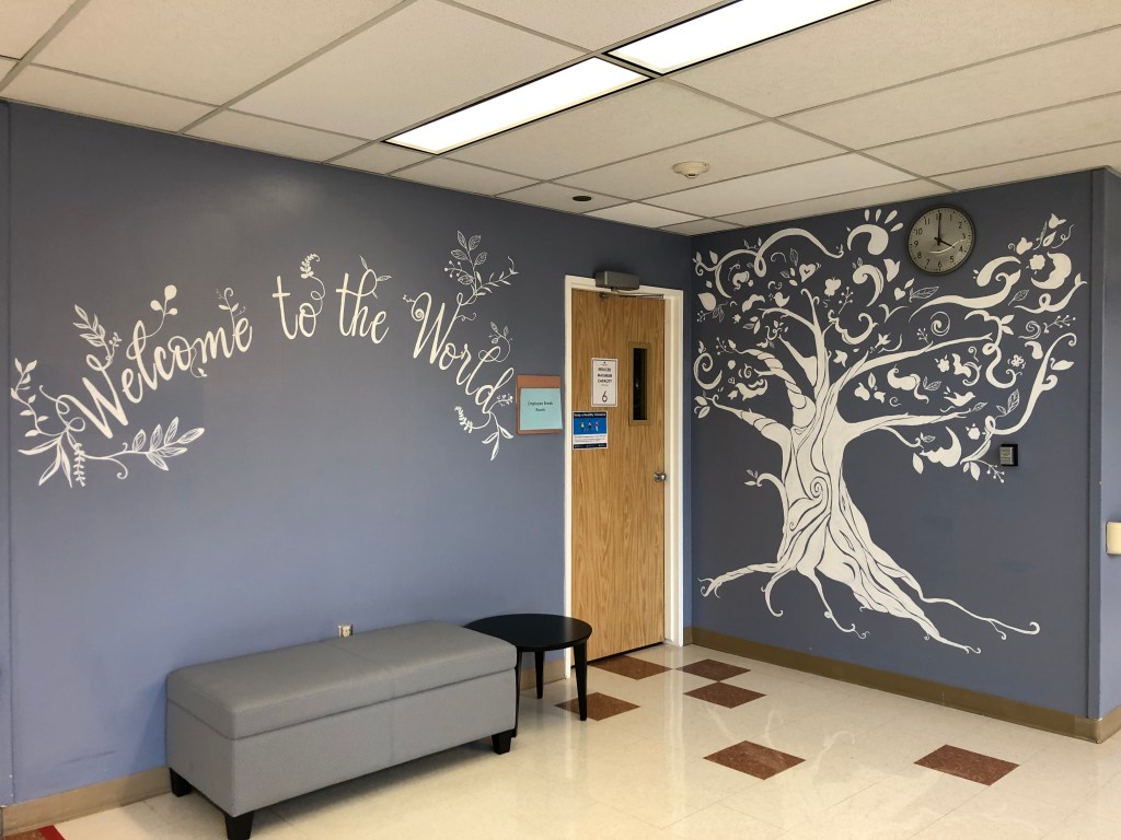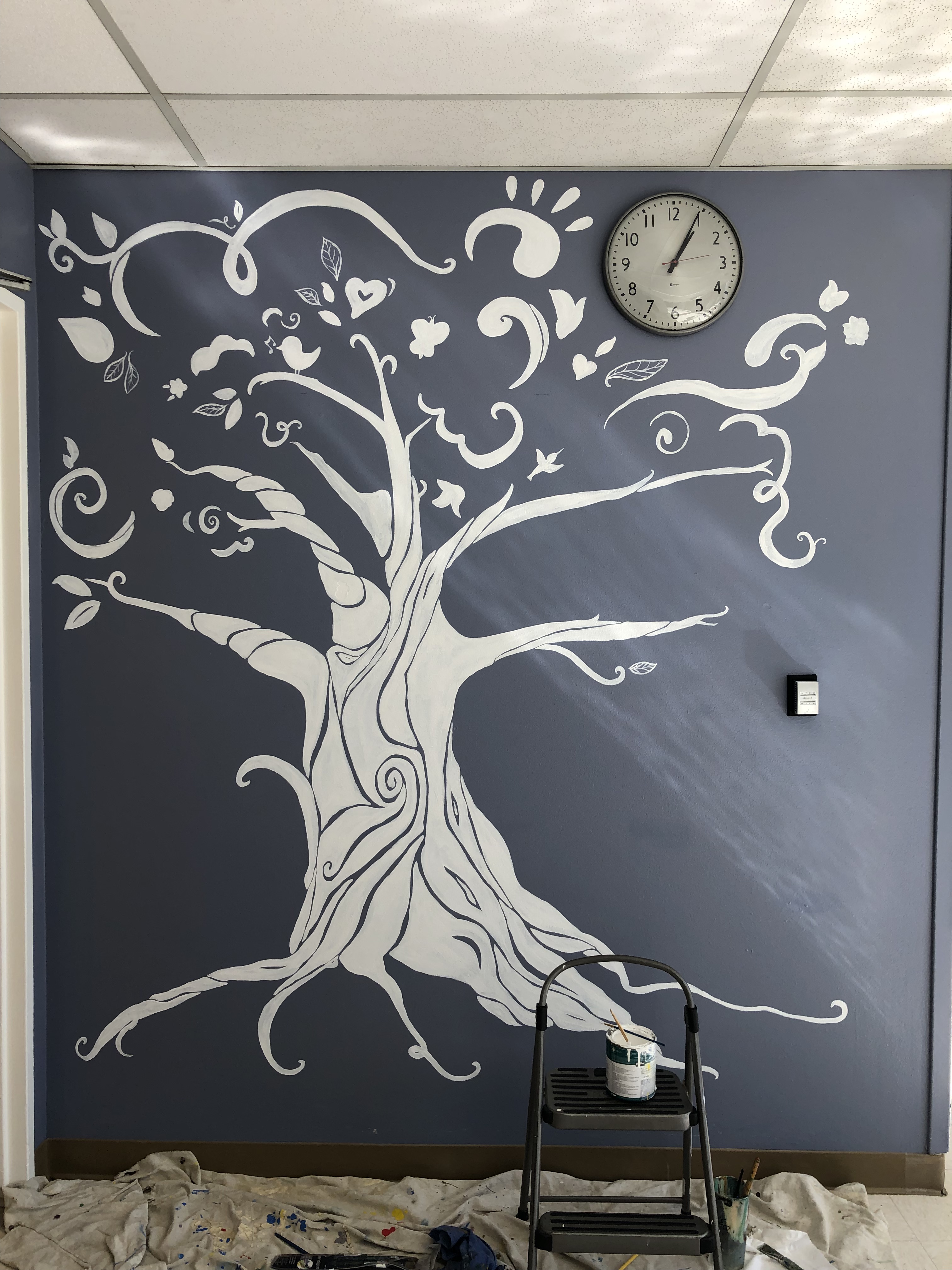October – Welcome tree mural painted on the adjacent lobby wall in O’Connor Hospital’s Birthing Center, San Jose, CA. Commissioned by the Valley Medical Center Foundation.