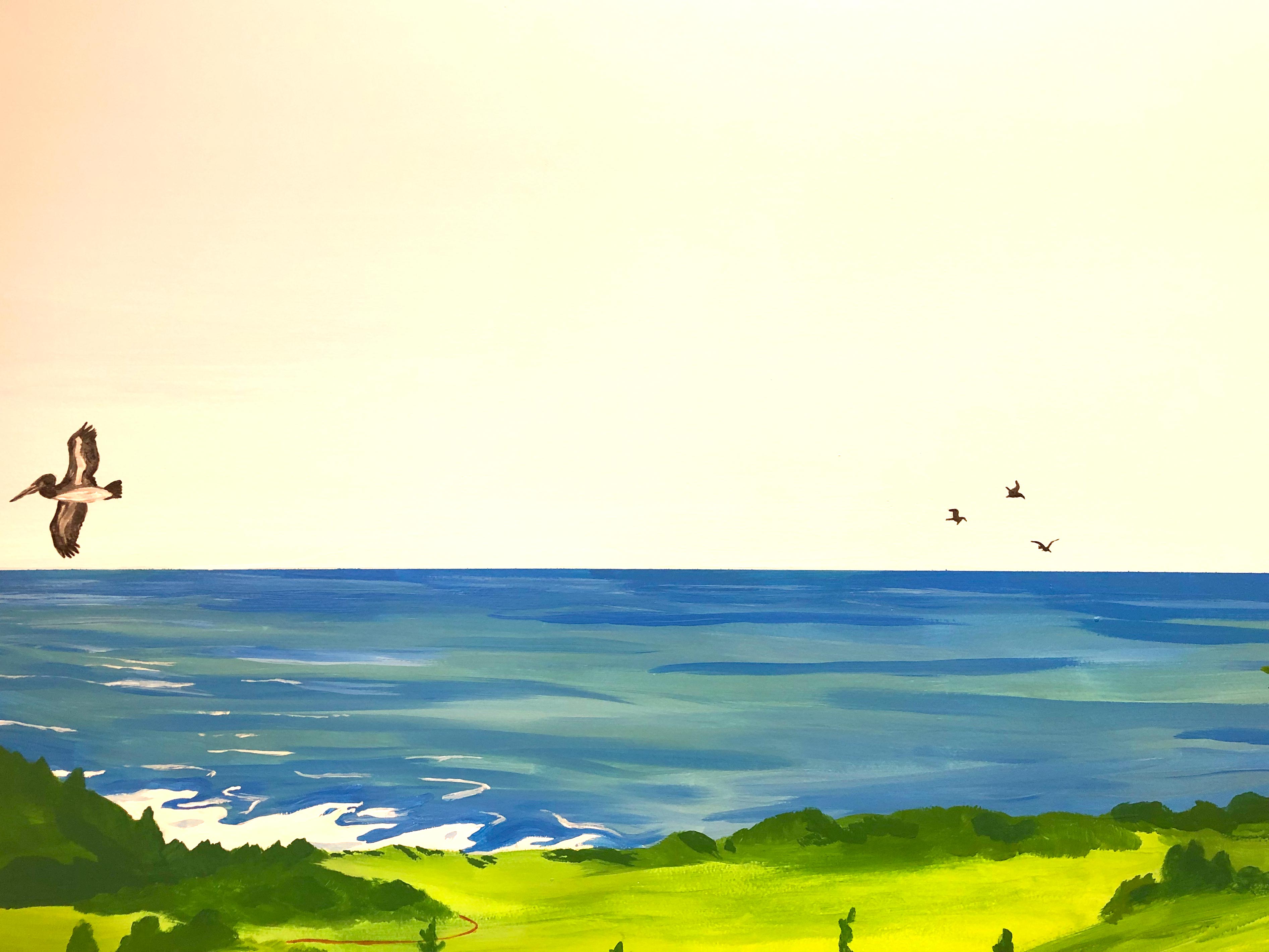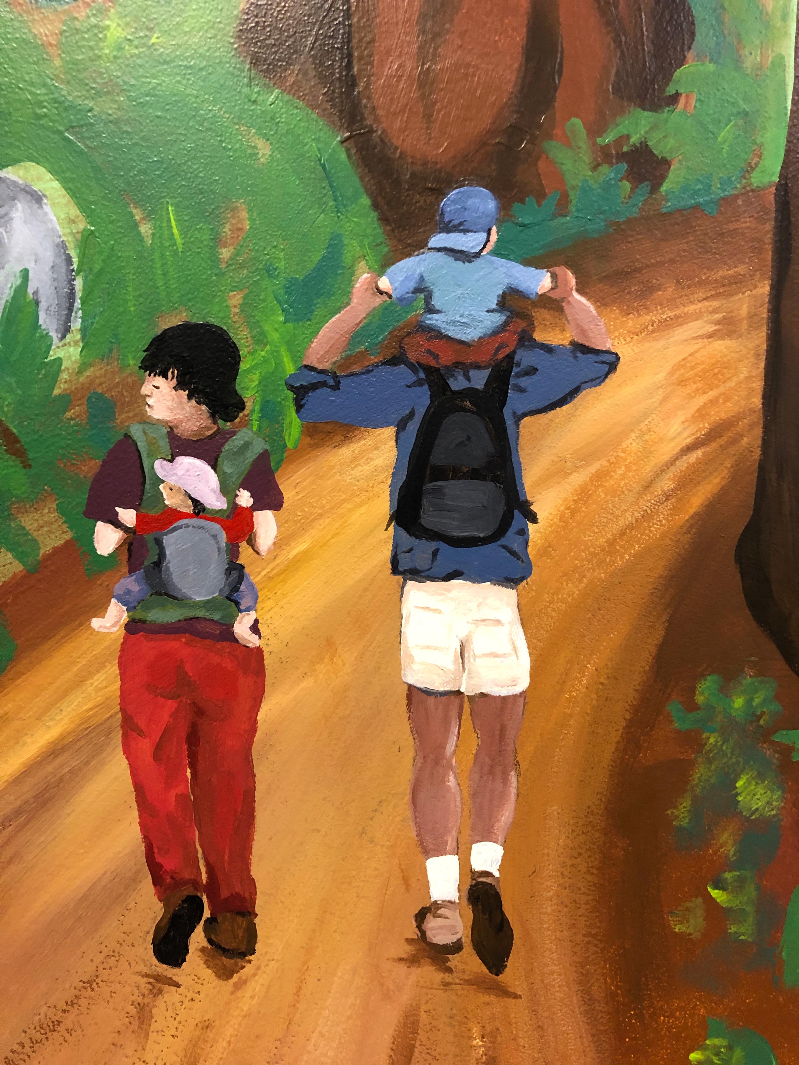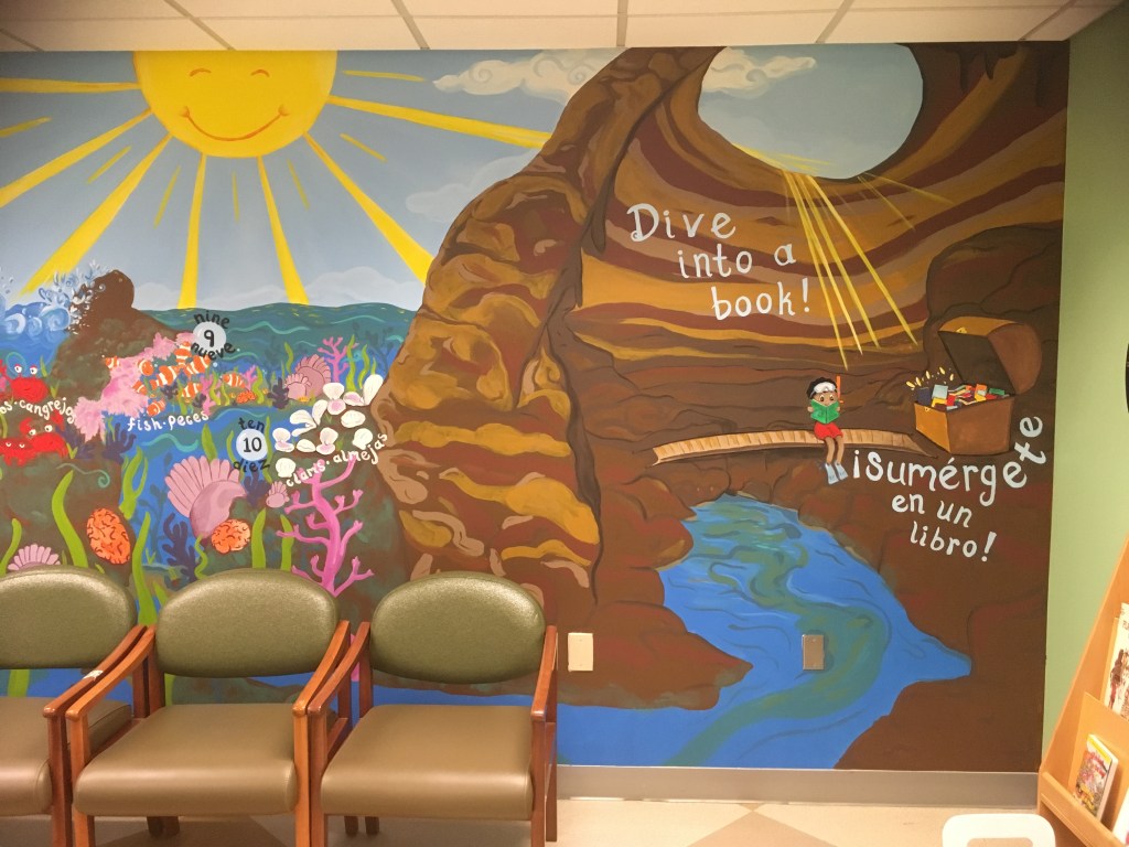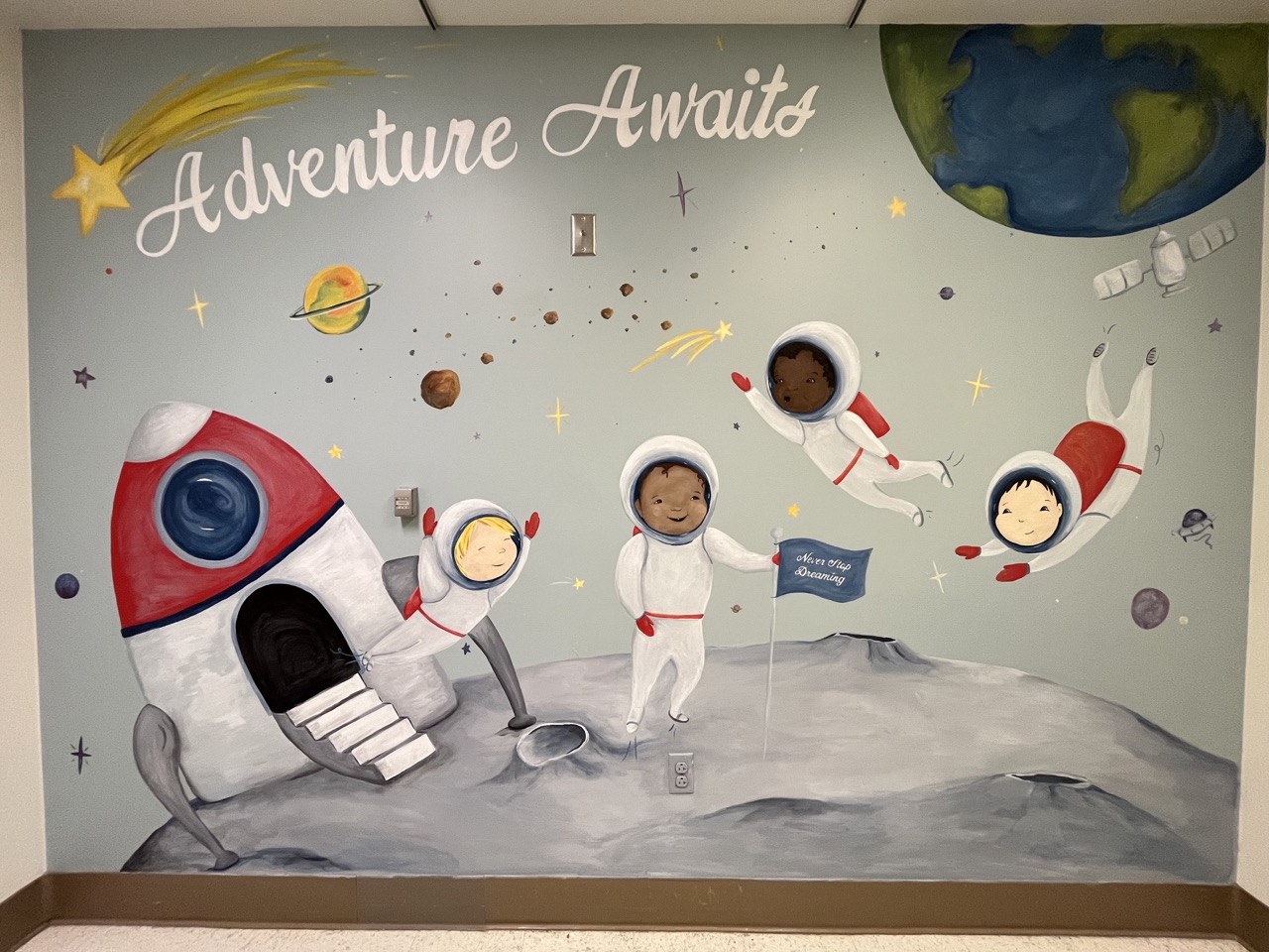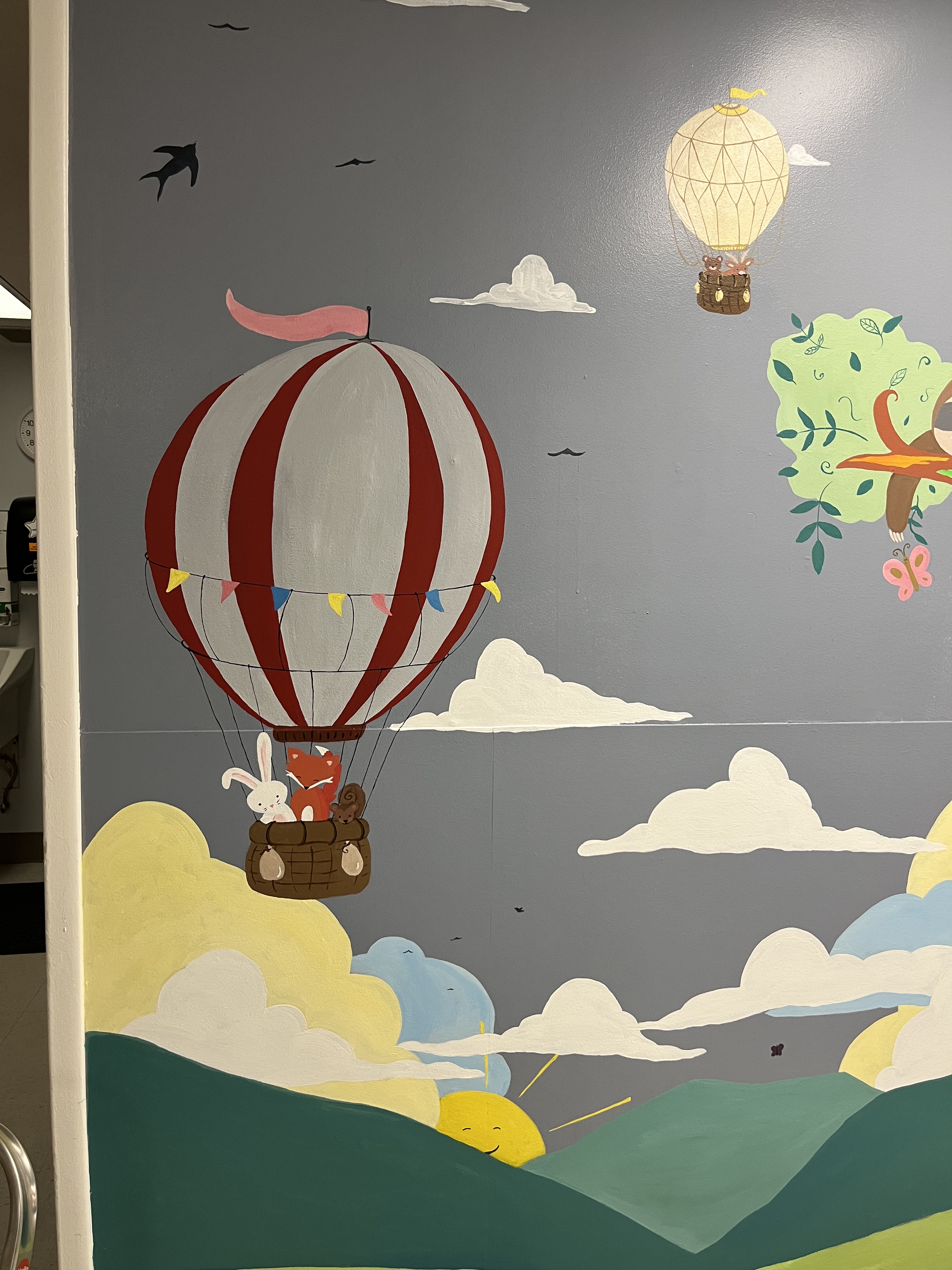 February – commissioned by the Valley Medical Foundation to do one more mural in the NICU at O’Connor Hospital in San Jose. The “Adventure Awaits” theme was decided by the nurses to provide a hopeful message to families who have babies in the NICU; I designed based on their inspiration image and attempted to try a watercolor style with the paint. This was painted on an 8′ x 11′ wall in the waiting room between Feb. 20-24th.