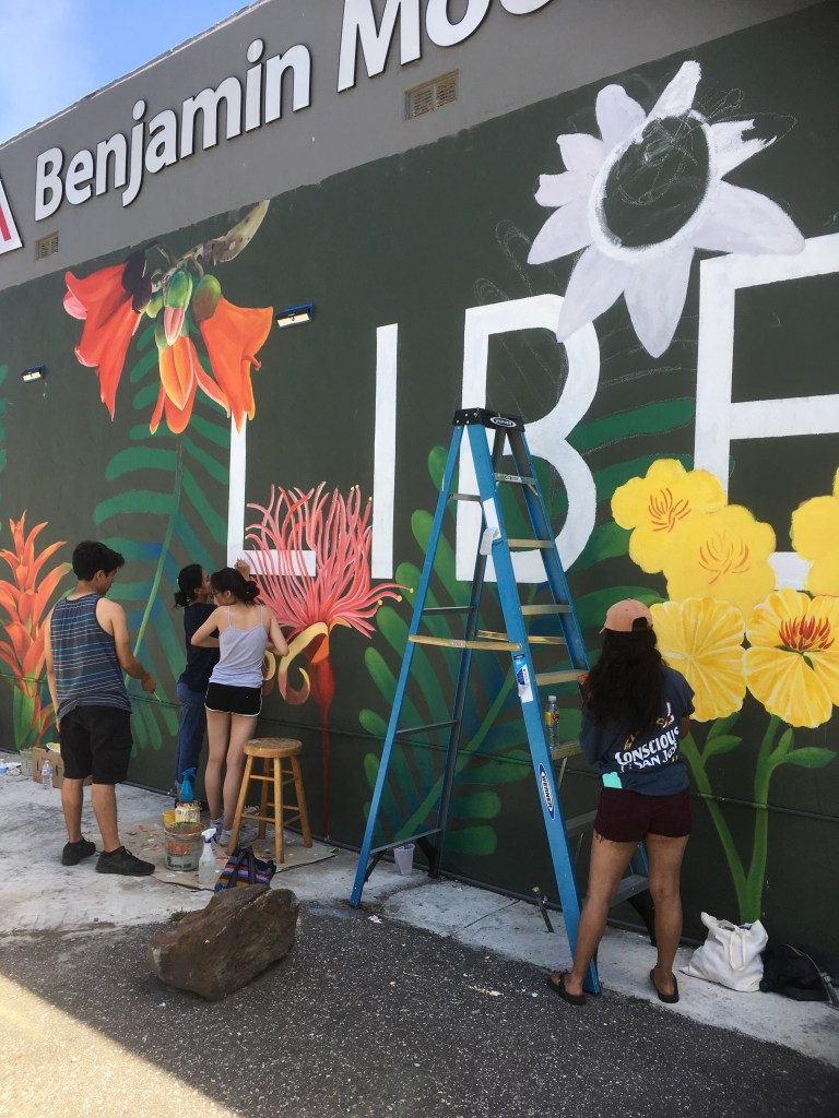 May-July 2019: I helped out a fellow art teacher friend, Jessica Gutierrez, who designed and coordinated a huge wall mural in east San Jose. I painted two giant flowers that were between 4′-6′ wide and 3′-4′ tall. Jessica and her high school students from James Lick H.S. did an incredible job on this project. Here are a few in-progress images: