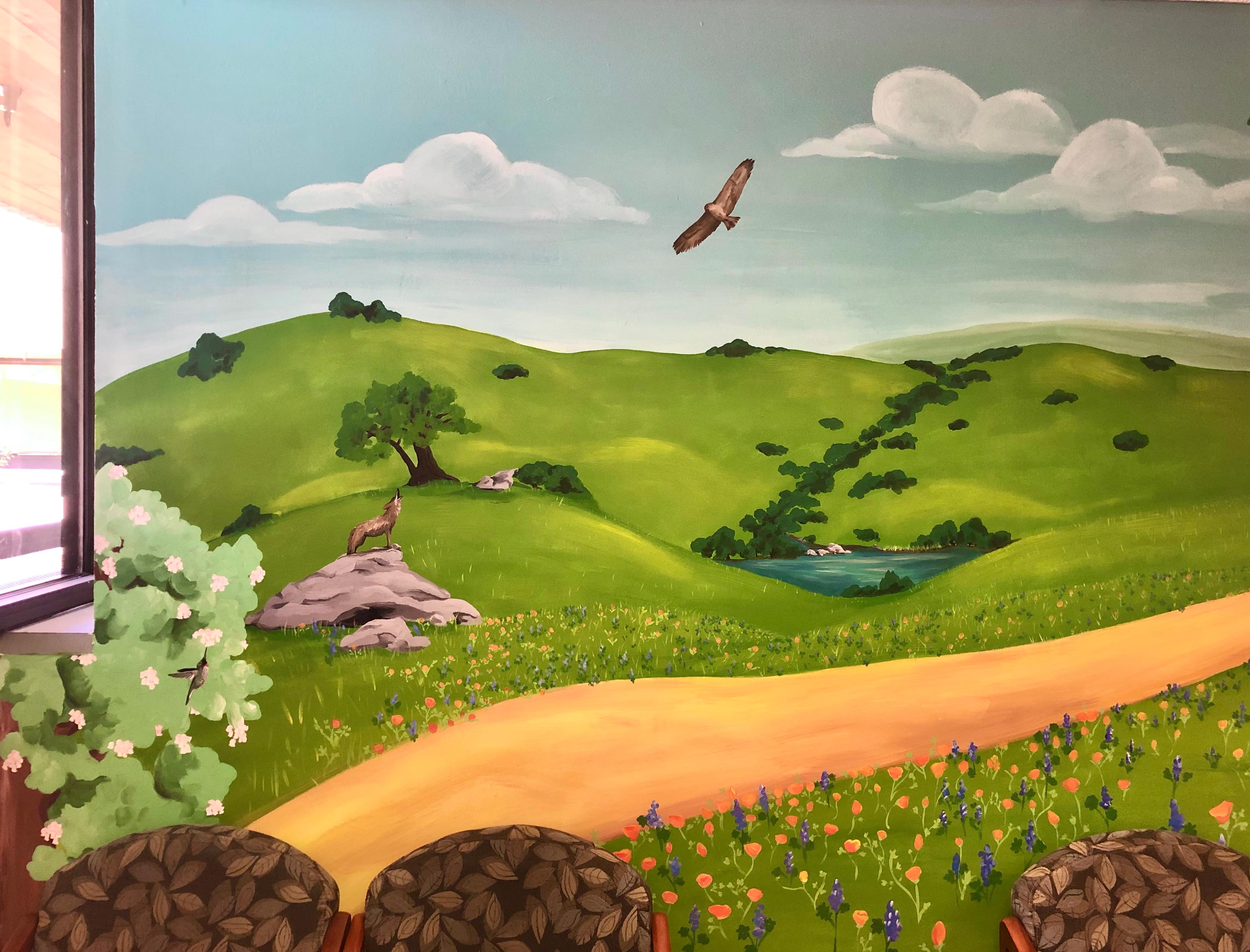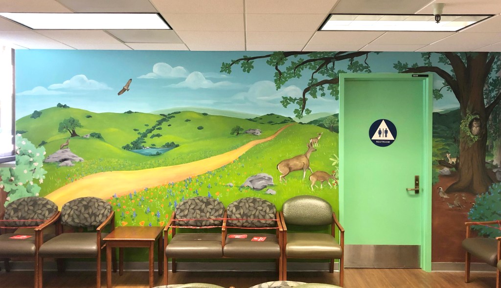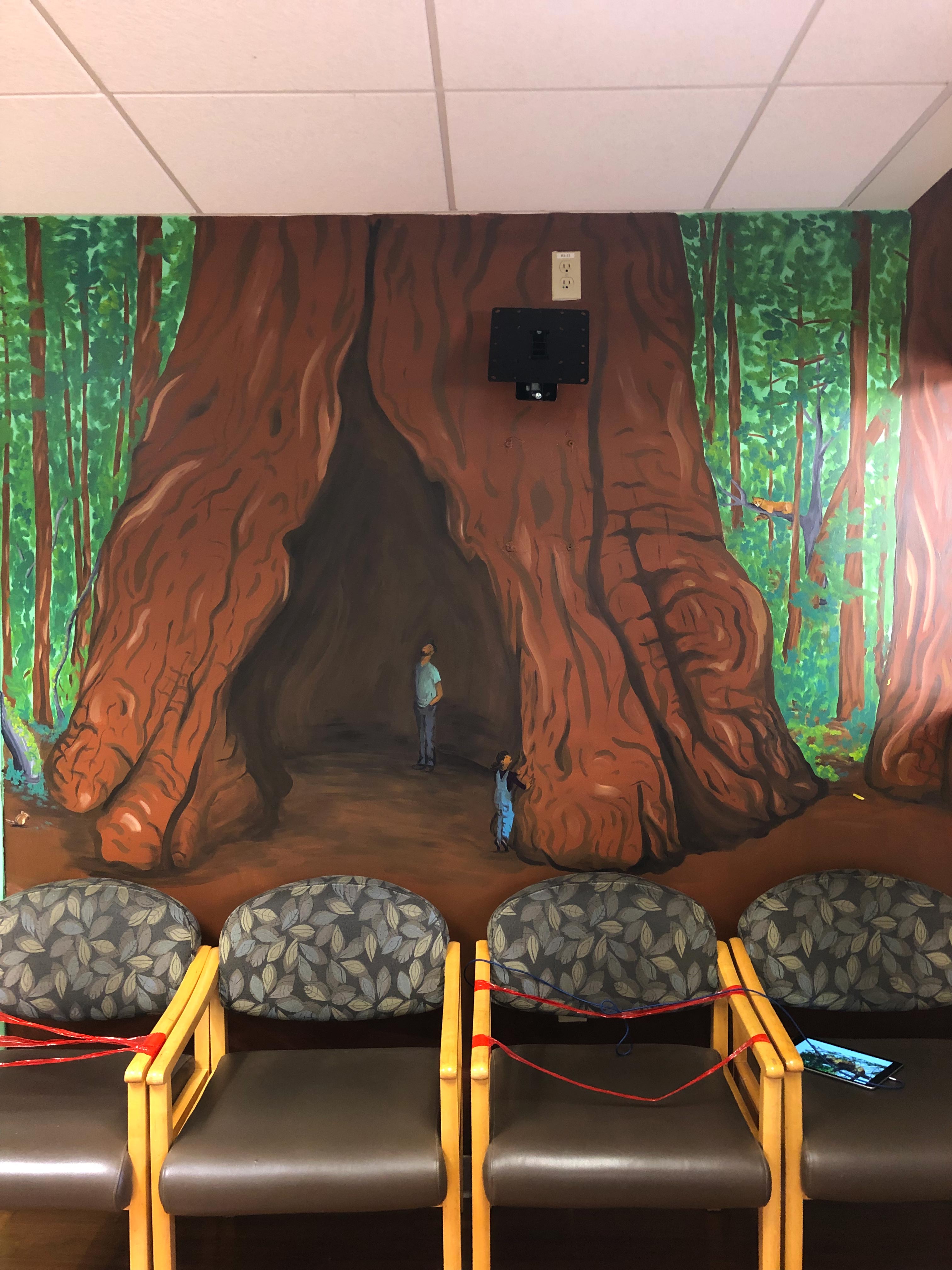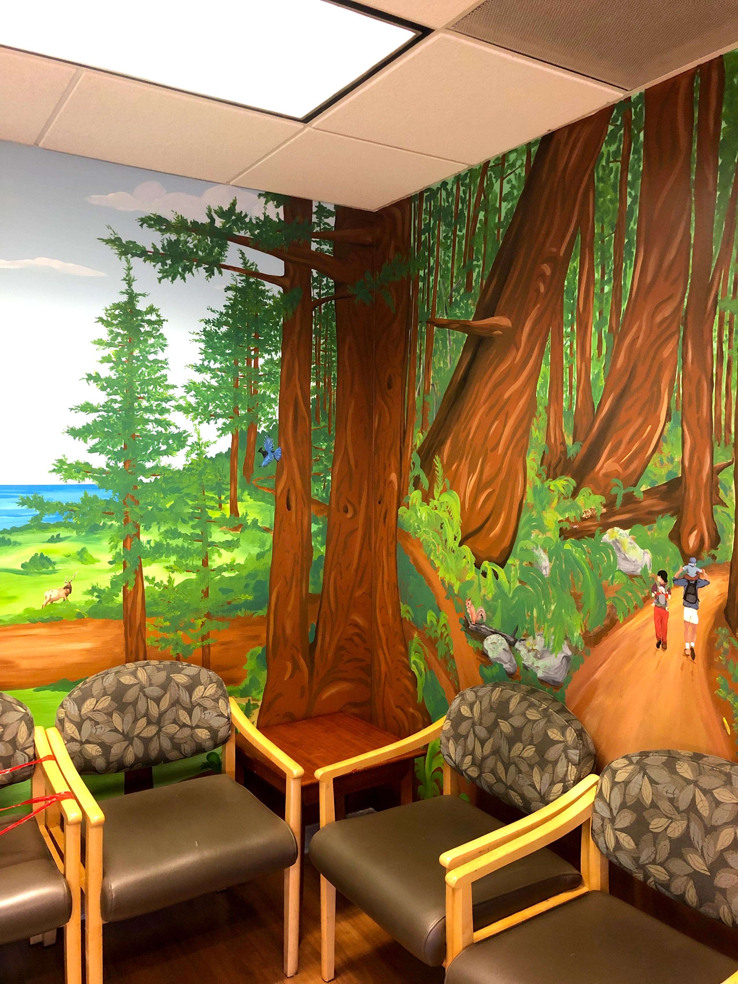 June-early August 2021: Two 2nd floor waiting rooms of the Pediatric unit at Valley Health Center Bascom in San José. I was commissioned to brighten up the two main waiting rooms with a focus on California’s natural environment. The first mural is centered on California’s oak woodlands and the second is on redwoods forests. See the gallery below for close-ups of both and the time-lapse videos that capture the entire process.