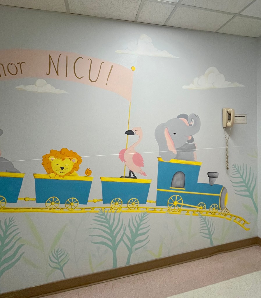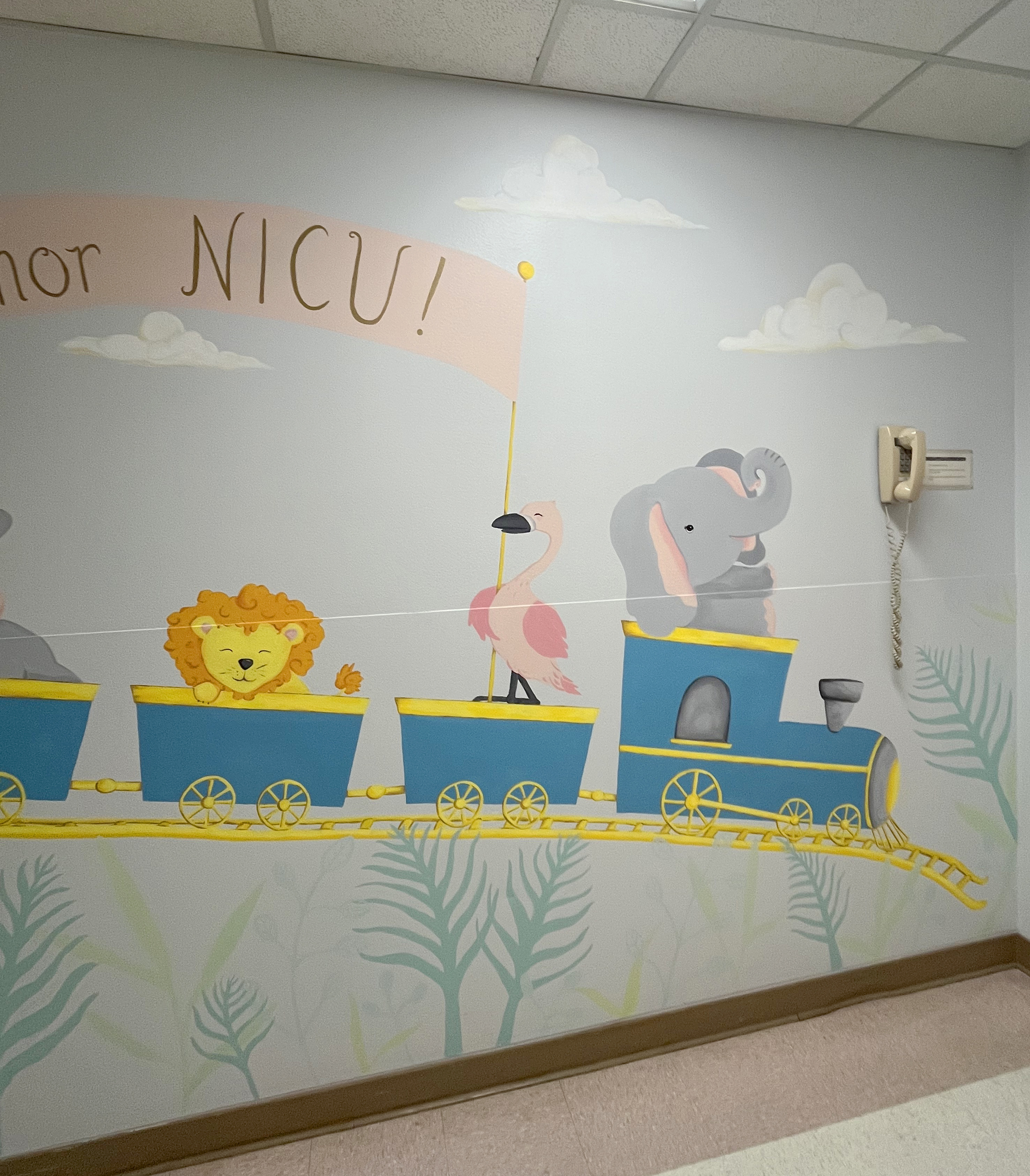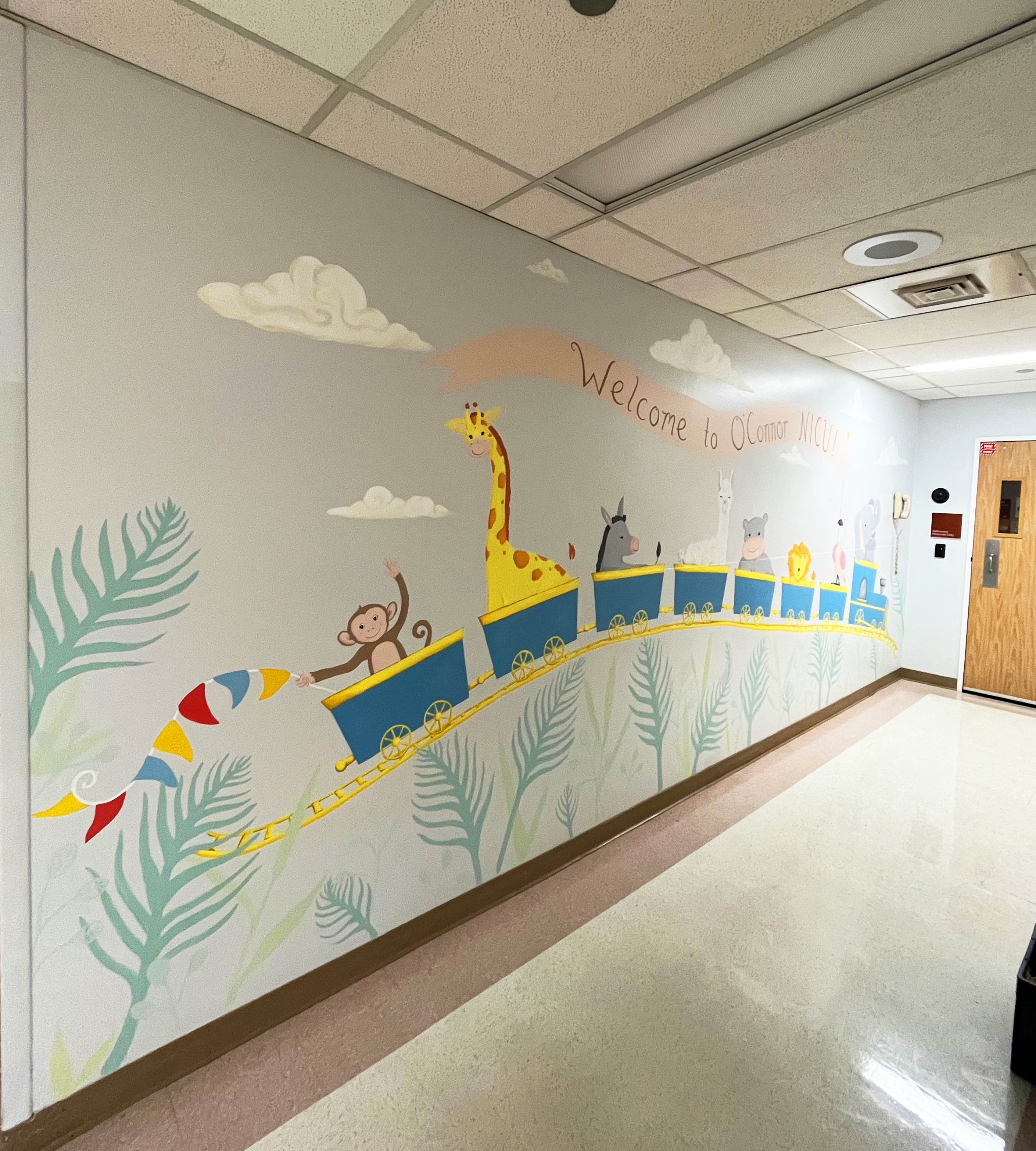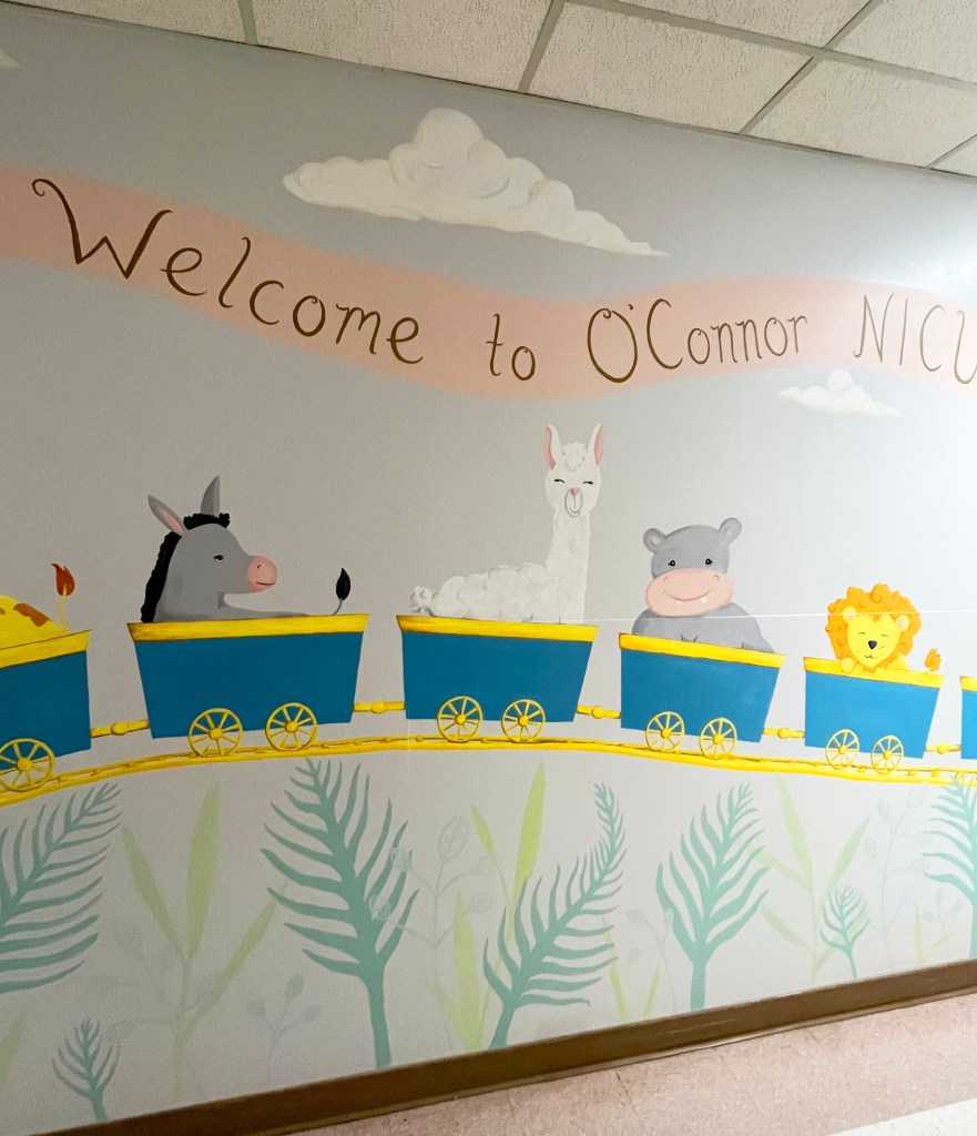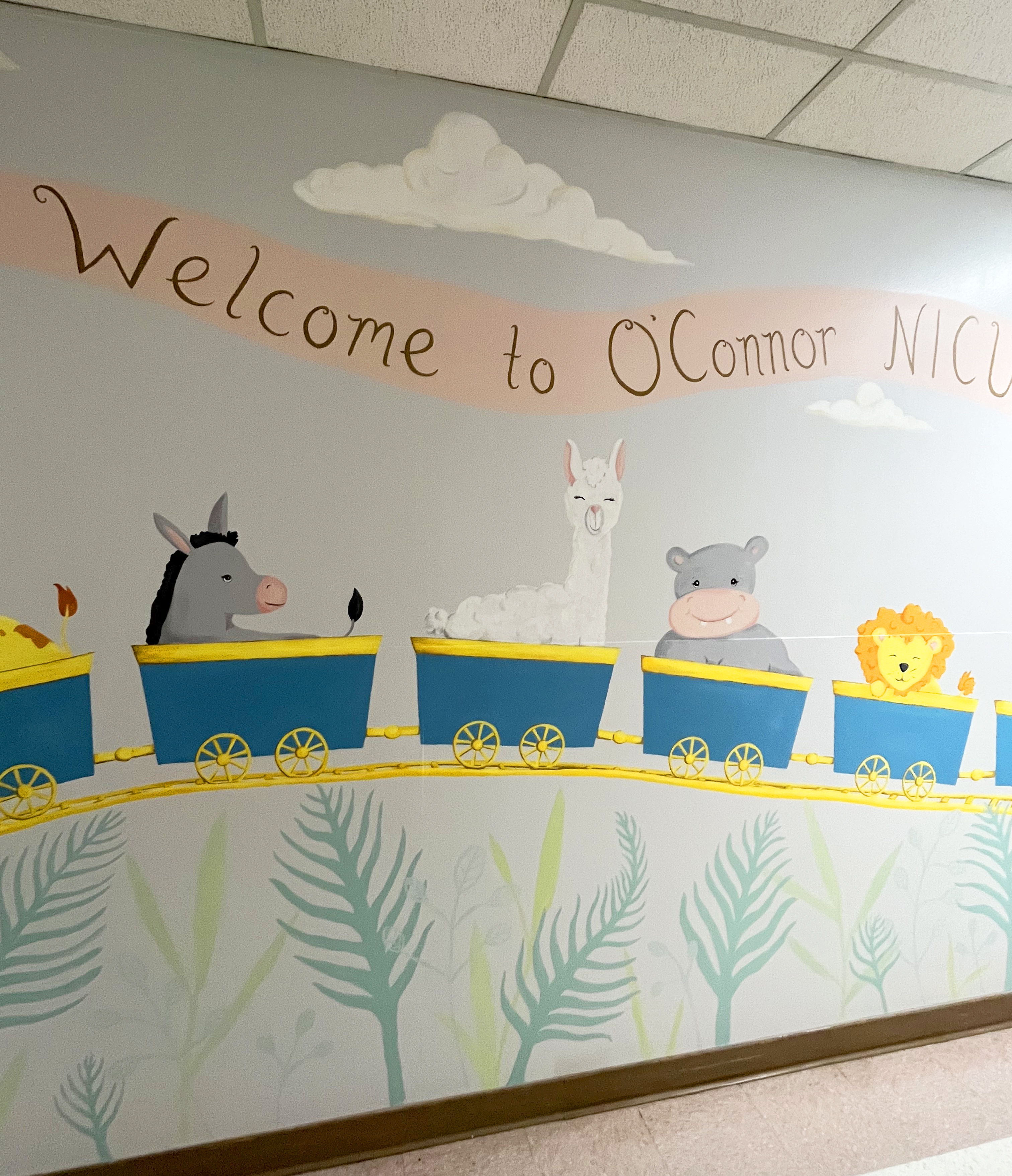 November – Photo op mural in the NICU at O’Connor Hospital, San Jose, CA. Commissioned by the Valley Medical Center Foundation. Design envisioned by the hardworking nurses so that outgoing patients and their parents can take photos to show the growth of the babies from the first day they were admitted. Chalkboard paint was used to create a reusable writing surface.